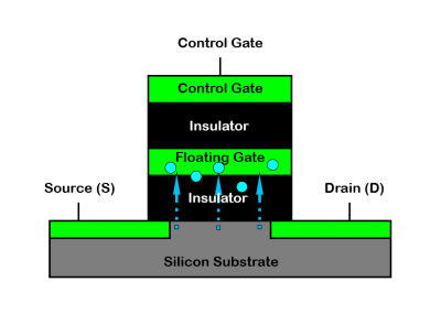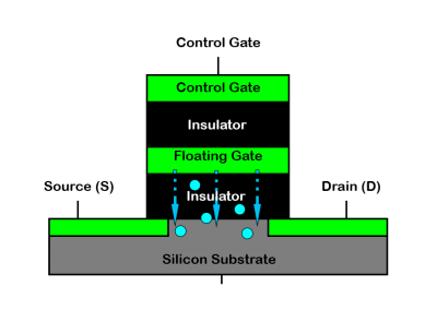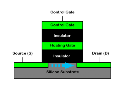 Il Control Gate funge da sensore I/O (con “I/O” si intendono i due stati che definiscono il valore di bit dato alla cella o letto dal controller, quindi “SI elettroni/NO elettroni”) mentre il Floating Gate - essendo di tipo poli-siliconico e avendo capacità conduttive - è in grado di trattenere gli elettroni, sia in assenza e sia in presenza di alimentazione.