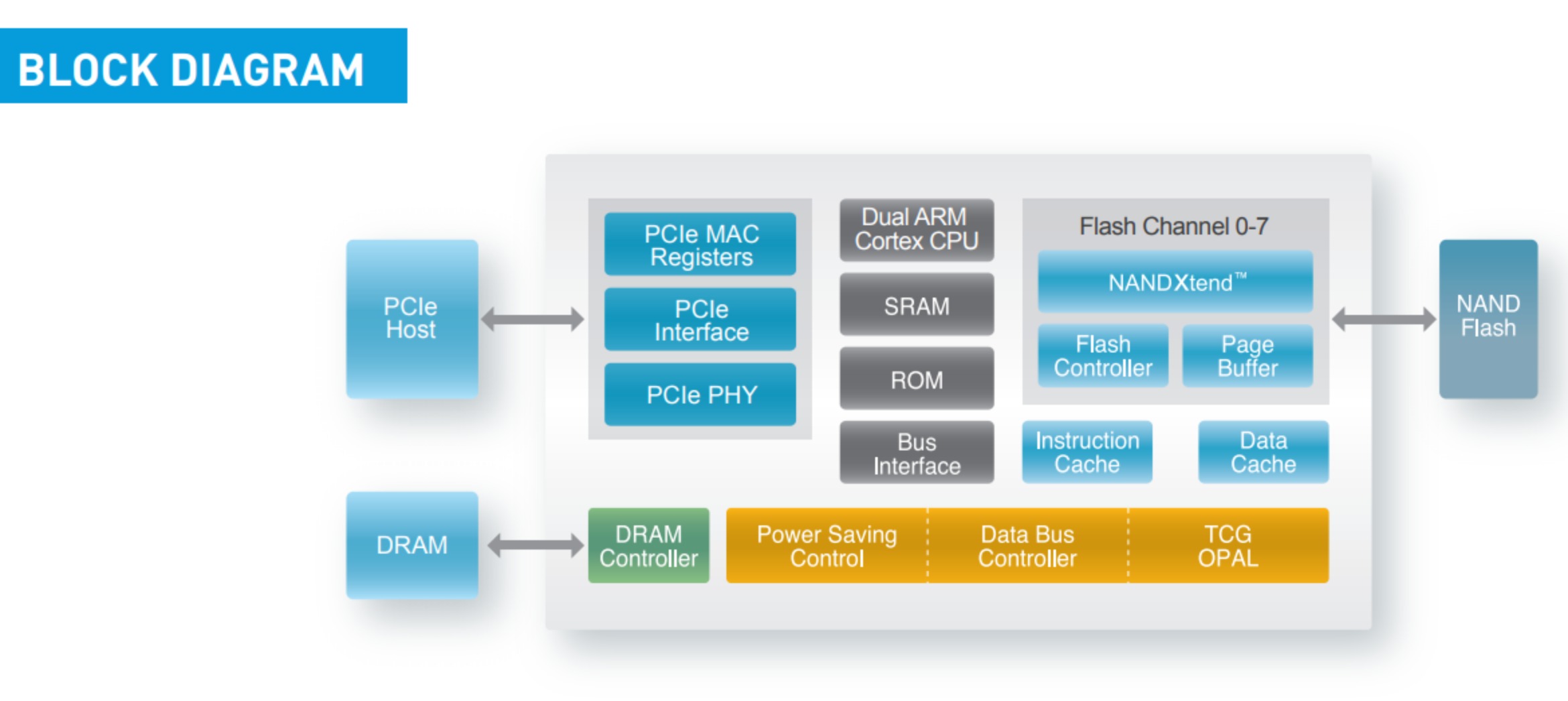 Qui un esempio di architettura in una diagramma a blocchi di un controller; in questo caso l’SM2262EN: