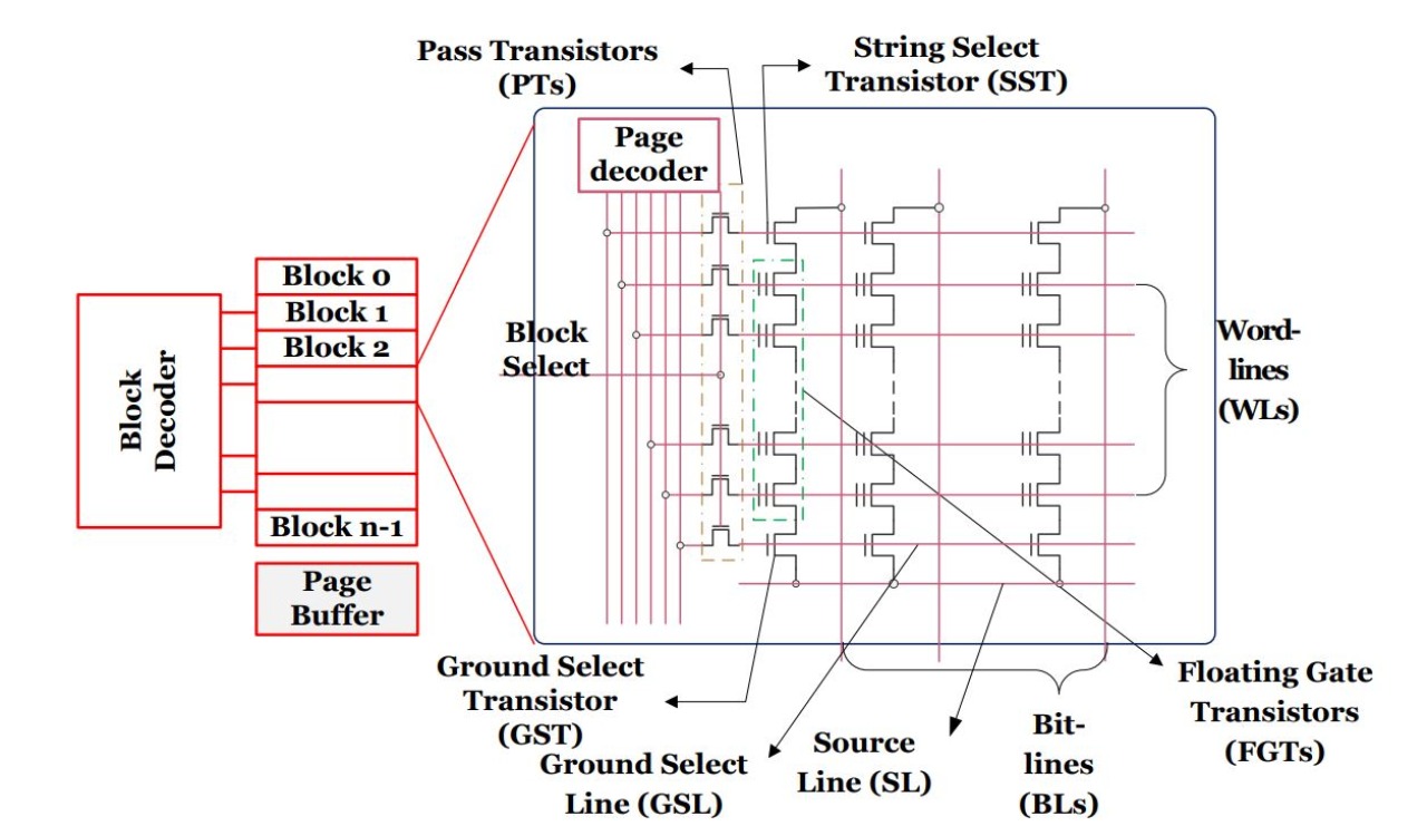 Organizzazione interna di un blocco - fonte: "MODELING THE PHYSICAL CHARACTERISTICS OF NAND FLASH MEMORY"