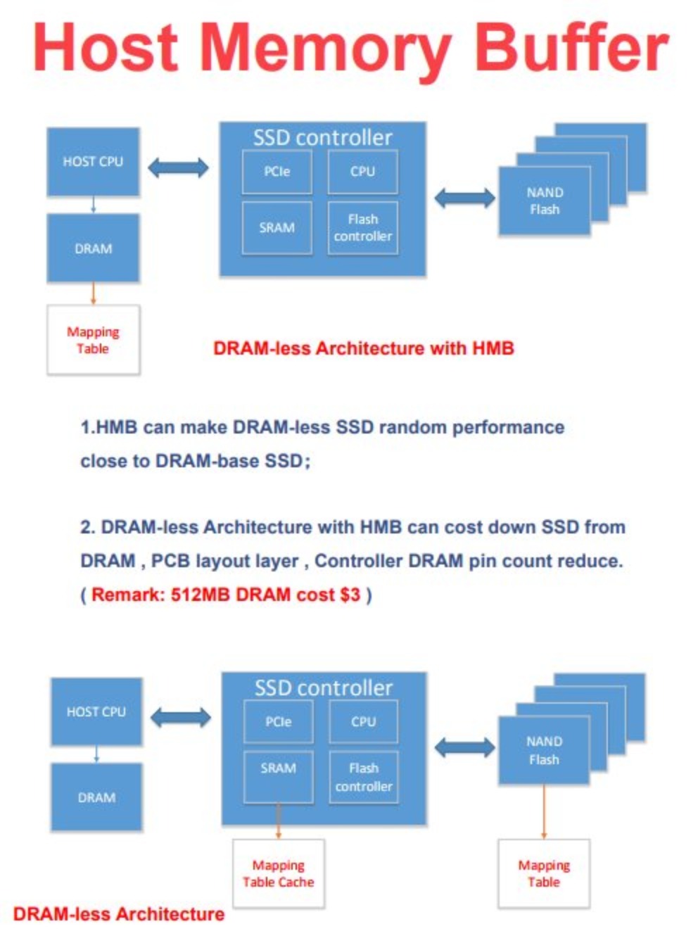 Gli SSD DRAM-less non sono così rari da trovare, sia per i SATA che per gli NVMe. Visto che gli SSD NVMe lavorano su un altro tipo di protocollo (e interfaccia), son riusciti a creare una tecnologia di nome “Host Memory Buffer (HMB)” che entra in soccorso con appunto gli SSD M.2 NVMe per aumentare le performance e la durata.