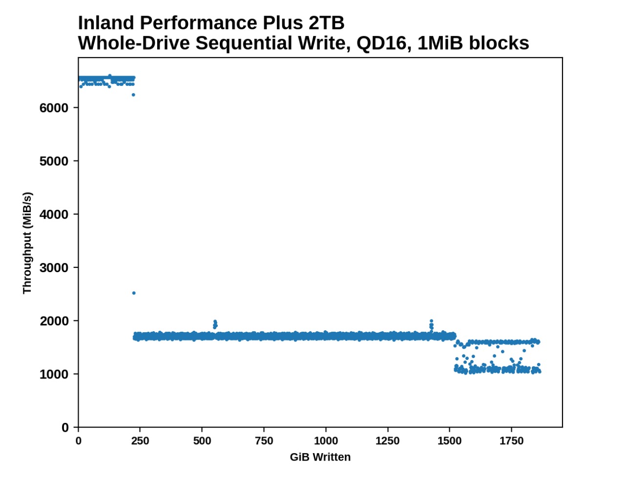 La SLC cache è una tecnologia presente ormai in tutti gli SSD che serve per aumentare le performance dell’SSD in scrittura sequenziale e la longevità del disco, se di un determinato tipo. La SLC cache non è una vera e propria NAND SLC ma è semplicemente una cache che permette di scrivere una cella per un bit (anche se è TLC o QLC), infatti può essere chiamata anche “pSLC (pseudo-SLC)”. In questo modo l’SSD prima di scrivere sulle celle (SLC, MLC, TLC, QLC) può scrivere in questa porzione di cache per avere prestazioni maggiori (dato che programma solo un bit come nelle NAND SLC) e, nel caso fosse statica, una maggiora durata. Qui un esempio con un Inland Performance Plus da 2 TB: