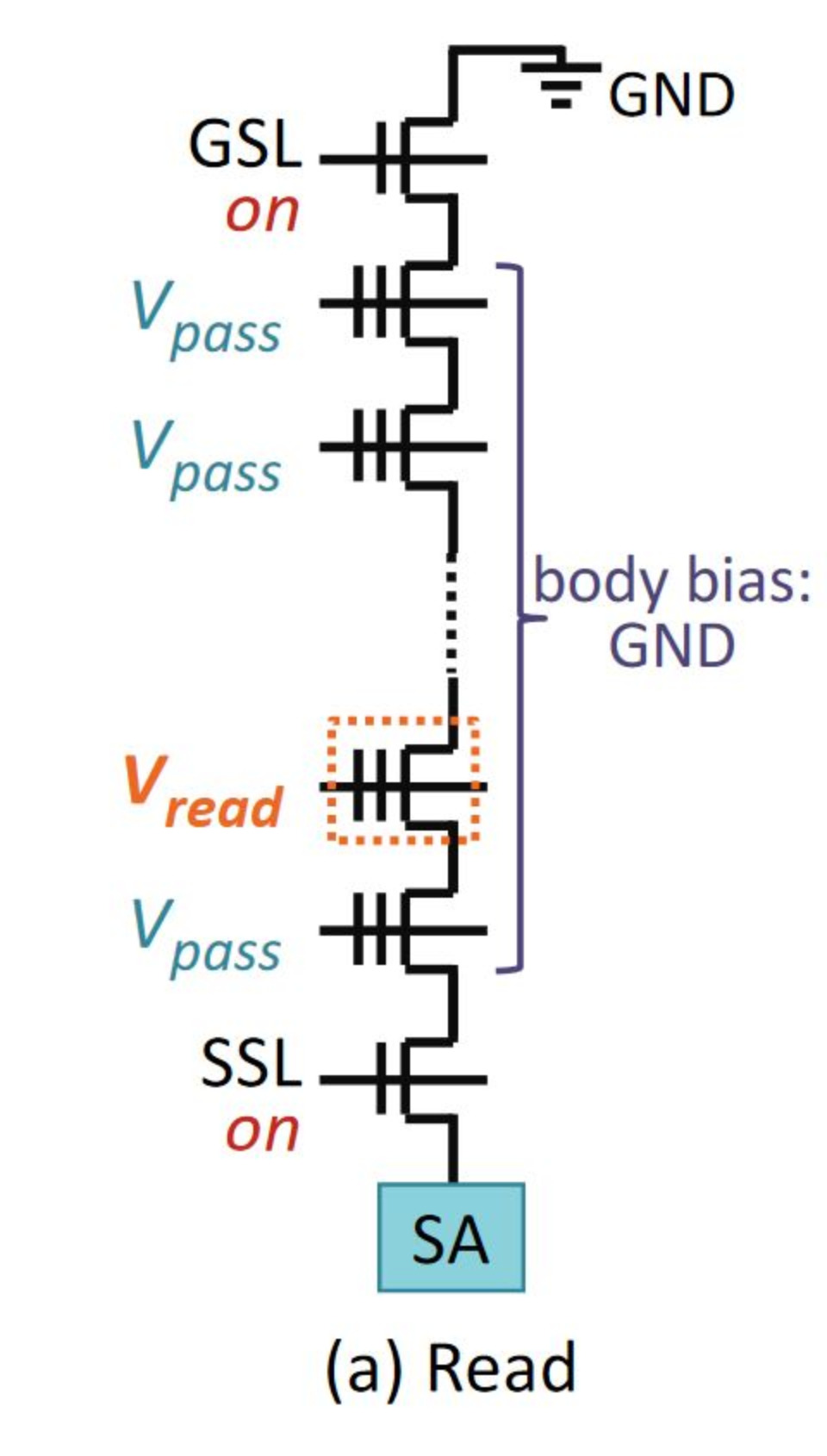 Per eseguire un’operazione di lettura, il controller determina l’indirizzo fisico della pagina da essere letto in base alla mappatura dell’indirizzo logico-fisico. Questo indirizzo viene poi passato alla “control unit” nel chip NAND Flash, che seleziona la pagina corretta utilizzando il set di decodificatori di blocco e pagina. Una volta che il blocco è selezionato, viene impiegato il rilevamento della corrente delle linee di bit per determinare se il floating gate in una cella NAND contiene carica o meno. Ciò si ottiene pilotando la tensione del control gate delle word line non selezionate a Vread. Questo fa sì che altre celle di memoria nella stringa servano come “transfer gate”. La tensione del control gate della word line selezionata è impostata su 0V. Se il floating gate non contiene carica, la cella di memoria è attiva (il trasferimento è di tipo a esaurimento) e la corrente scorre attraverso la stringa. Se il floating gate contiene carica, la cella di memoria non è attiva perché il floating gate ha una tensione di soglia più elevata e la corrente non scorre attraverso la stringa. I “sense amplifiers” collegati a un’estremità della linea di bit rilevano il flusso di corrente. L’assenza del flusso di corrente è considerato un “1” logico mentre la sua presenza indica uno “0”. I dati sono quindi trasferiti dai latch al controller dove la logica ECC esegue il controllo degli errori e correzione.