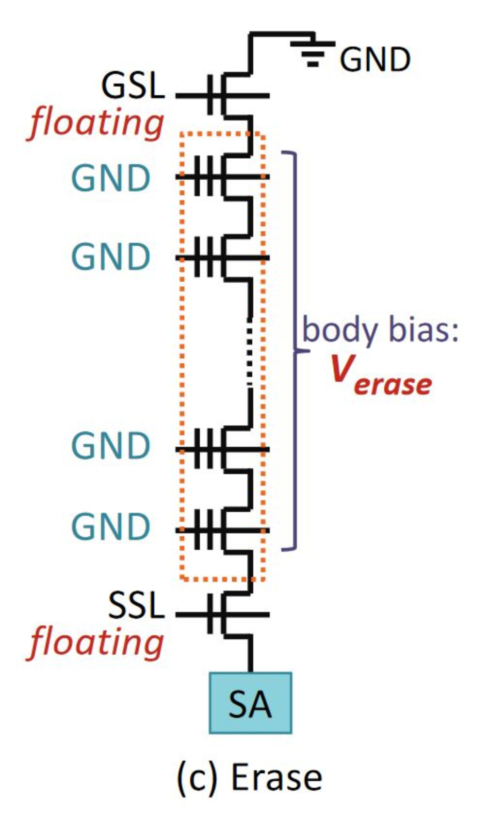 Quando l’FTL nel controller determina che il numero di pagine libere è estremamente basso, il controller invia un comando di cancellazione alle NAND Flash. I livelli dell’FTL hanno la propria politica per determinare quale blocco deve essere recuperato. Una volta che l’indirizzo fisico del blocco da cancellare è determinato dal controller, questo viene passato alla NAND Flash. La control unit nella NAND Flash seleziona il blocco da cancellare utilizzando il decodificatore di blocco. I control gate di tutte le word line nel blocco selezionato sono messe a terra e il “P-well” del blocco è polarizzato a Verase (tensione). Ciò causa il campo tunnel degli elettroni delle cariche del Floating Gate al P-well per le celle programmate 0, mentre le celle non programmate corrispondenti a “1” logico vengono sovracancellate. A differenza di un’operazione di scrittura in cui l’effetto tunnel avviene su più impulsi di programma, la cancellazione avviene in un singolo impulso di cancellazione perché la sovracancellazione non è un problema nelle memorie NAND Flash. Poiché più blocchi in un array condividono un P-well comune, è possibile che i blocchi non selezionati nello stesso array che condividono lo stesso P-well possano essere inavvertitamente cancellati. Sono state proposte diverse tecniche per inibire la cancellazione dei blocchi non selezionati. Una di queste tecniche è chiamata “inibizione della cancellazione automatica” che utilizza l’accoppiamento capacitivo tra i control gate delle varie celle e il P-well. Prima di applicare la tensione di cancellazione al P-well, i control gate dei blocchi non selezionati delle NAND Flash che condividono lo stesso P-well con il blocco selezionato vengono fatti galleggiare chiudendo i “pass gate”. I control gate sono accoppiati dato che il P-well è polarizzato su Verase, il che fa sì che i blocchi non selezionati vengano automaticamente inibiti dalla cancellazione.