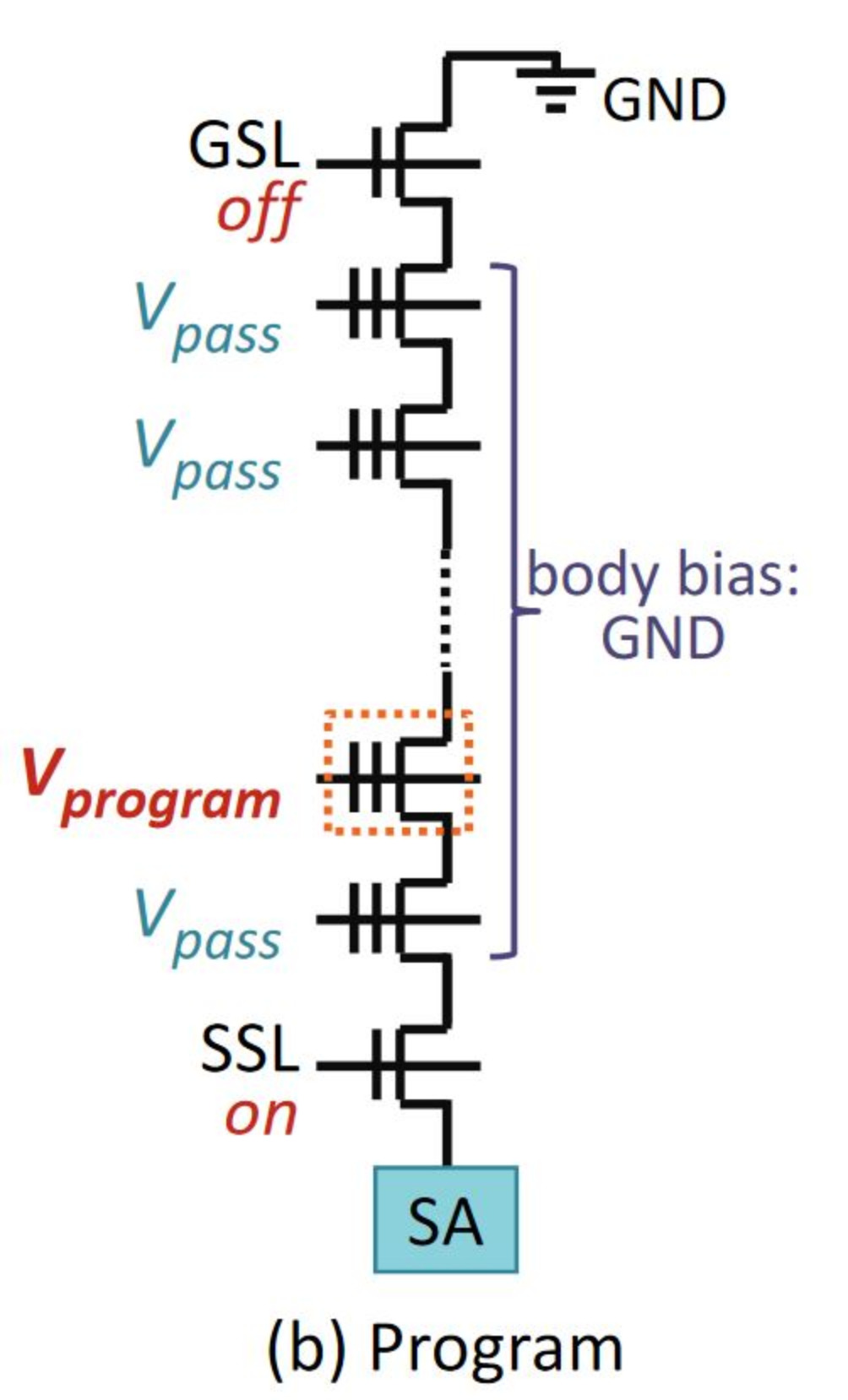 Per eseguire un’operazione di programmazione, ovvero scrivere “0” nelle celle desiderate, il controller dell’SSD deve determinare l’indirizzo fisico della pagina da programmare. Per ogni operazione di scrittura è necessario scegliere una pagina valida libera perché la memoria NAND Flash non consente l’operazione di sovrascritture sulla stessa pagina (come invece permettono di fare gli hard disk, per quanto quest’ultimi non abbiano pagine ma tracce). Il controller trasmette quindi alla NAND Flash il comando per la programmazione, i dati da programmare e l’indirizzo fisico della pagina. Quando dal controllor arriva una richiesta per un’operazione di programma viene selezionata una riga dell’array di memoria (corrispondente alla pagina richiesta) e i latch nel buffer di pagina vengono caricati con i dati da scrivere. L’SST (String Select Transistor) viene quindi attivato mentre il GST (Ground Select Line) viene disattivato dalla control unit. Affinché si verifichi l’effetto tunnel, è necessario un campo elettrico elevato posto il floating gate e il silicio come abbiamo già detto prima. Questo elevato campo elettrico si ottiene impostando il control gate della riga selezionata su un’alta tensione Vpgm e polarizzando le linee di bit corrispondenti allo “0” logico. Ciò crea un’elevata tensione tra il floating gate e il silicio, comportando il passaggio tra questi due. Per la programmazione logica “1” (che è sostanzialmente una non-programmazione), la cella di memoria dovrebbe rimanere nello stesso stato di prima dell’operazione di scrittura. Sebbene vengano adottate diverse tecniche per prevenire l’effetto tunnel degli elettroni per tali celle, assumiamo l’operazione di inibizione del programma auto-potenziato. Questa tecnica fornisce la necessaria tensione della programmazione di inibizione pilotando le bit line corrispondenti a “1” logico a Vcc e accendendo SSL e spegnendo GSL. Quando la word line della riga selezionata sale al Vpgm, la capacità in serie attraverso il control gate, il floating gate, il canale e il “bulk” vengono accoppiati, aumentando automaticamente il potenziale del canale e prevenendo l’effetto tunnel degli elettroni.