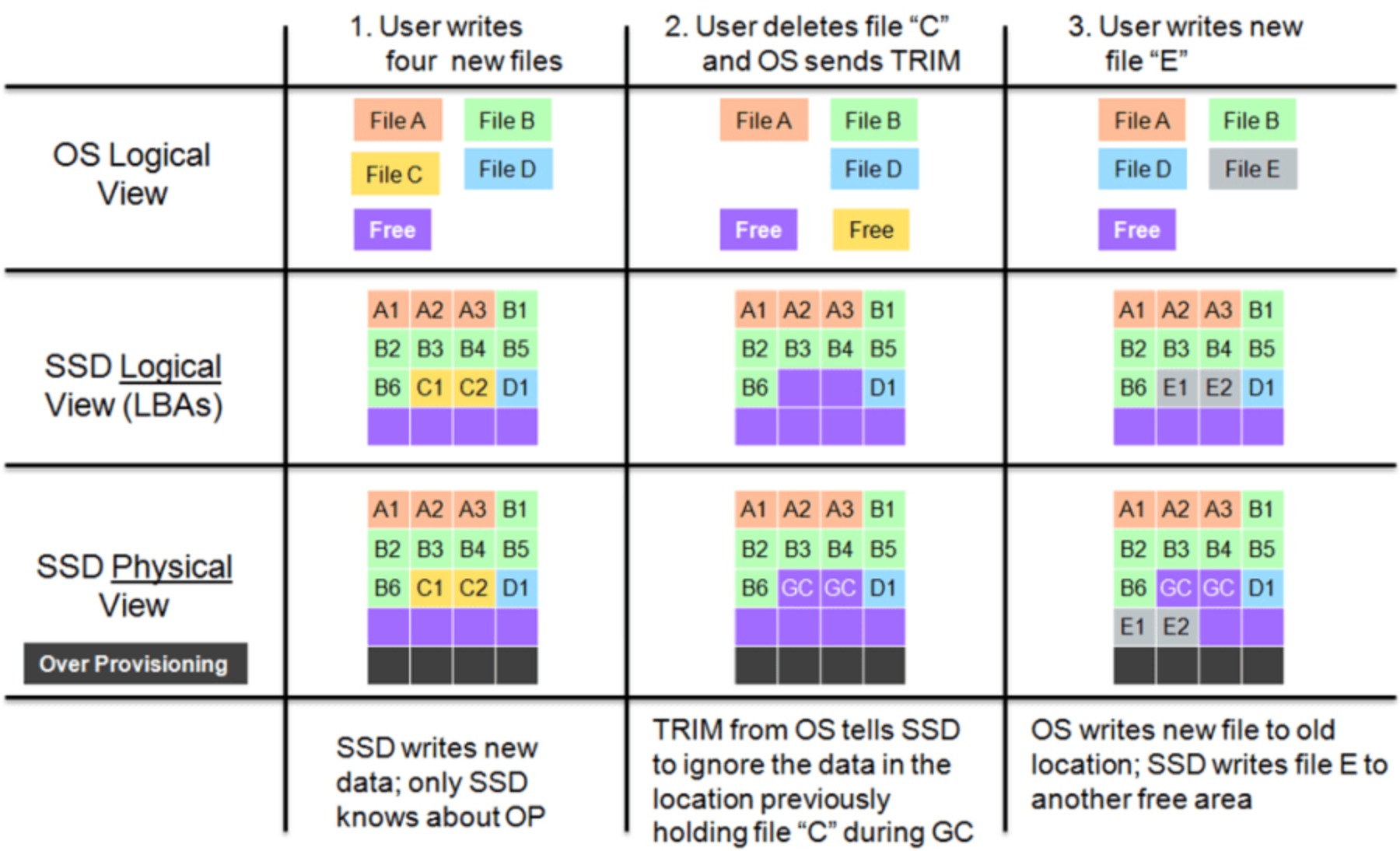 Il TRIM invece è un comando AT che contrassegna i blocchi come inutilizzati per il sistema operativo, quindi è considerabile come l’aiutante del garbage collection. Un sistema operativo (come Windows) ottimizza un SSD eseguendo il retrim, quindi contrassegnando i blocchi “finiti” e che verranno cancellati per delle scritture future. Visto che le NAND per essere riscritte devono essere cancellate, il TRIM assieme al garbage collection è un comando importante per mantenere al meglio la salute e le prestazioni dell’SSD. Punto da tener conto è che il TRIM è meno importante sulle unità più moderne dato che il garbage collection è più aggressivo, specialmente con la memorizzazione dei bit nella cache SLC. Dopo che il TRIM ha svolto il suo compito, ci sono diversi modi in cui i valori verranno letti: non deterministico (ogni lettura restituirà dati diversi), deterministico (DRAT - tutti i dati restituiranno lo stesso) e deterministico di lettura zero (RZAT - tutti i comandi restituiscono zero).