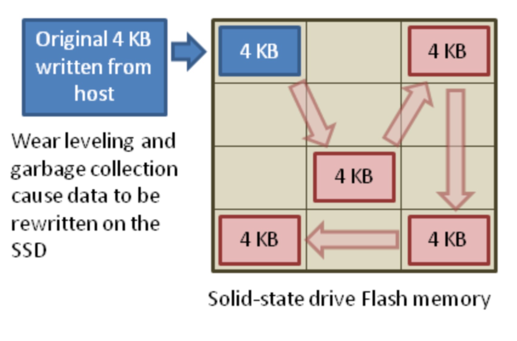 Qui una rappresentazione del WAF; il wear leveling e il garbage collection contribuiscono nell’aumentare il WAF generale: