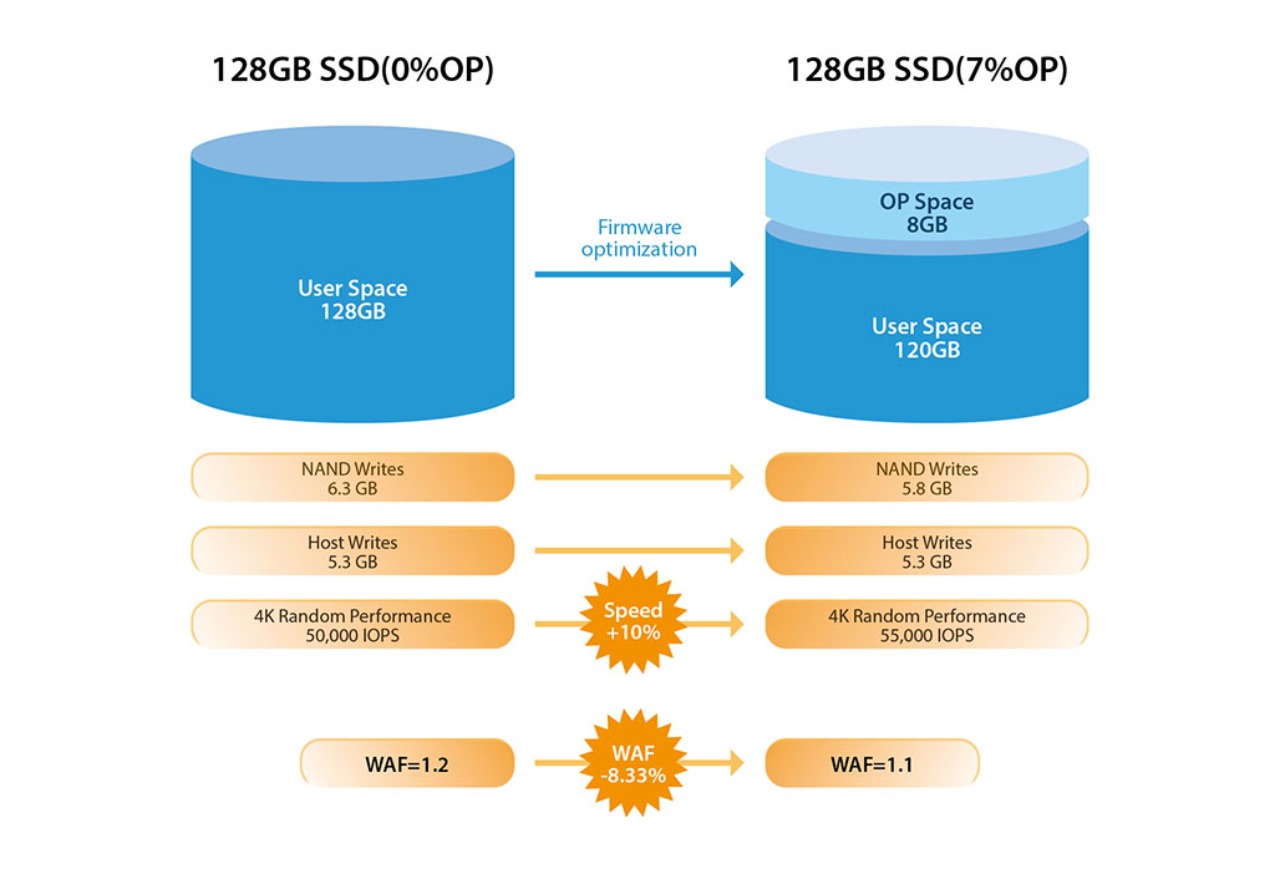 Qui una foto che mette in mostra a sinistra un SSD da 128 GB senza OP e a destra uno con il 7% sempre da 128 GB: